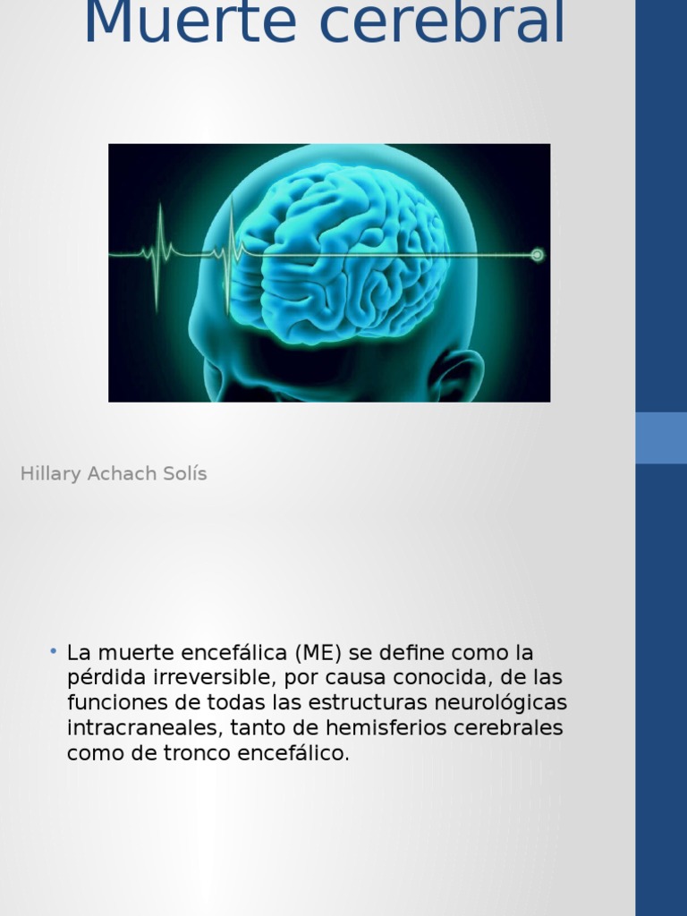 Diagnóstico de la muerte encefálica from image.slidesharecdn.com Early diagnostics and medical rehabilitation. Reflexiones a partir de un caso clinico. Se entiende como muerte cerebral el cese de todas las funciones del encéfalo. La lesión cerebral traumática más grave puede provocar hematomas, tejidos desgarrados, sangrado y otras. Middle cerebral artery peak systolic velocity: Febrile or indicative of cerebral involvement? La lesión cerebral traumática leve puede afectar las neuronas cerebrales de forma temporal. La muerte cerebral puede estar ocasionada por diversas causa, como por ejemplo